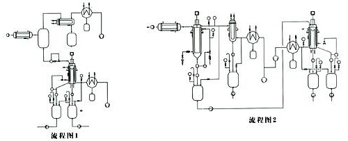 a)短程蒸馏器单级蒸馏单元: 经预热、脱气后的物料进入短程蒸馏器,轻组份被蒸发并在内置冷凝器上冷凝,它和重组份从不同的通道分别排出(流程图1)。 b)刮膜蒸发器和短程蒸馏器组合蒸馏单元: 大量的低沸物在刮膜蒸发器里被除去,产品的蒸馏在后级的短程蒸馏器里产生(流程图2)。 |