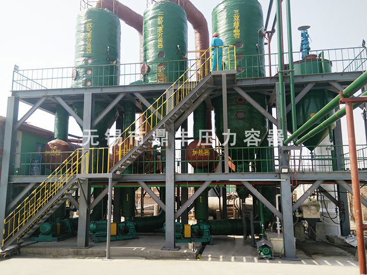 工作时,原料液由进料泵进入,经流量计、调节阀进入利用三效蒸发分离出来的二次蒸汽作为热源的预热器进行预热。约预热至50℃左右,之后进入二效蒸发器,物料在二效蒸发器内与二效加热器循环加热过程中不断蒸发,达到一定浓度,利用二效与三效间的压力差,物料以额定流量进入三效蒸发结晶器,物料在三效蒸发结晶器内与二效加热蒸发器相同方式进行不断加热蒸发,达到一定浓度,物料进入三效出料逆流泵,逆流泵出来的物料调节额定流量进入一效加热蒸发结晶器,在强制循环蒸发结晶室内经强制循环泵输送至加热器,加热后的料液循环进入蒸发分离室,物料在真空作用下,快速被蒸发,浓缩后的料液下行,在导流筒作用下减速自然沉降下行,在此过程中,过饱和溶液析出晶体,同时也在导流筒作用和锥底作用下,晶体往下沉淀至锥底部,经泡析腿由晶浆泵抽出,分离室边上清母液经循环管与强制循环泵循环至加热器,然后到蒸发分离器,如此不断循环蒸发,母液不断被蒸发析出晶体,待稳定后,根据析出晶体量调整出料晶浆泵流量,同时调整进料量,以达到与出料量和蒸发量的平衡,这时即可进行连续进出料。